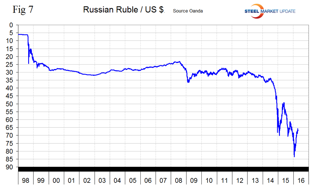 Figure 7 shows the value of the Russian Ruble since January 1998.