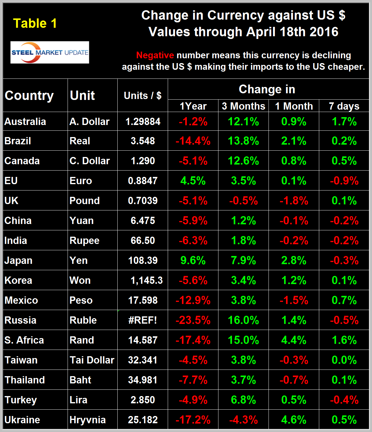 Table 1 shows the change in currencies of 16 steel and iron ore trading nations in one year, three months, one month and seven days for each currency and is color coded to indicate strengthening of the dollar in red and weakening in green.
