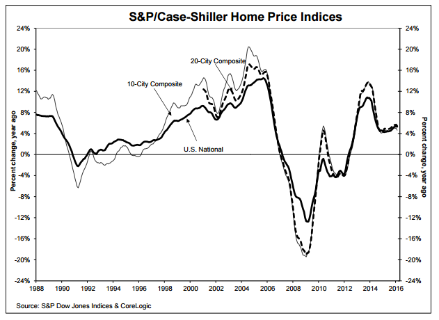 The S&P/Case-Shiller U.S. National Home Price Index indicated home prices continued to rise over the past 12 months but at a slower growth rate.