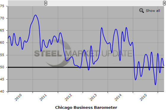 Below is a graph showing the history of the Chicago Business Barometer. You will need to view the graph on our website to use it’s interactive features, you can do so by clicking here. If you need assistance with either logging in or navigating the website, please contact our office at 800-432-3475 or info@SteelMarketUpdate.com.