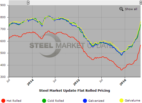 SMU Note: Below is a graphic showing our hot rolled, cold rolled, galvanized, and Galvalume price history. To use the graphs interactive capabilities, you must view it on our website here. If you need help navigating the website or need to know your login information, contact us at info@SteelMarketUpdate.com or by calling 800-432-3475.