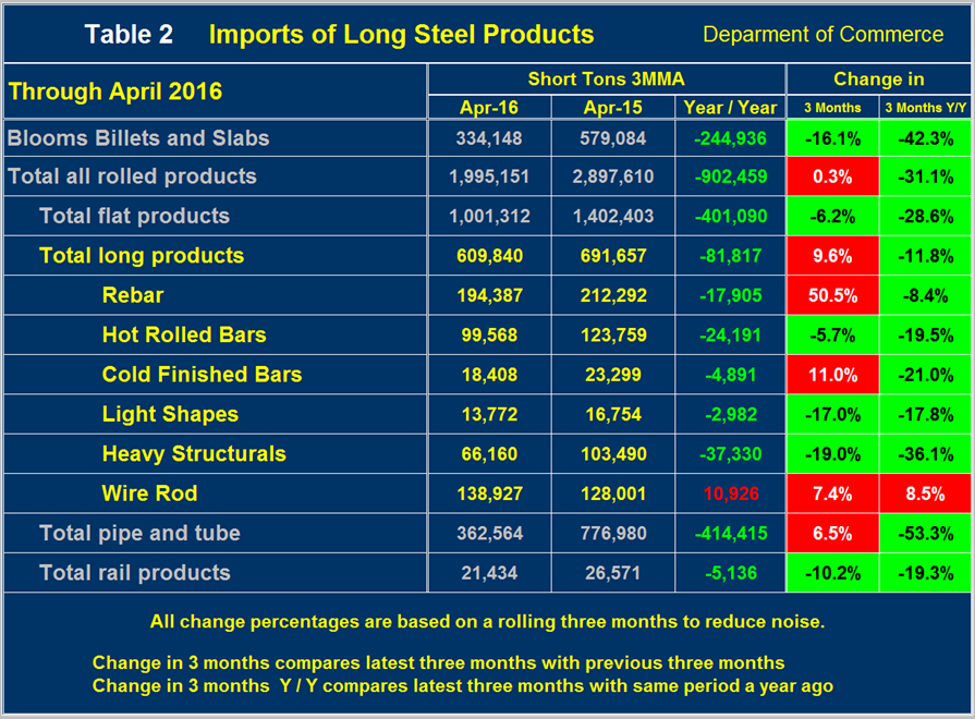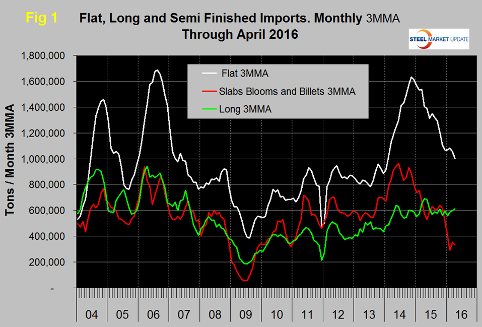 Flat includes all hot and cold rolled sheet and strip plus all coated sheet products plus both discrete and coiled plate. The 3MMA of flat rolled imports peaked at 1,634,000 tons in November 2014 and at 1,078,045 tons in April 2016 has been < 1.1 million tons for five consecutive months. Long product imports have been range bound between 519,000 tons and 772,000 tons since March 2014 with no particular trend evident. In April the 3MMA of long product imports was 609,840 tons.