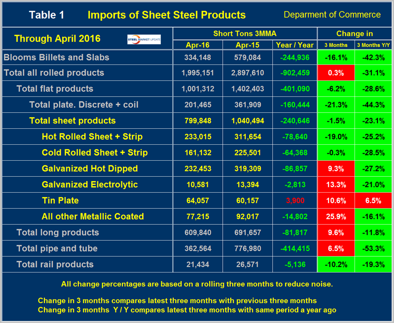 Table 1 provides an analysis of major product groups and of sheet products in detail. It compares the average monthly tonnage in the latest three months through April with both three months through January (3M/3M) and three months through April 2015 (Y/Y).