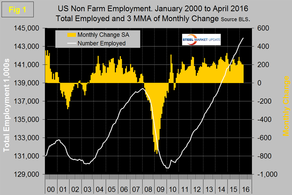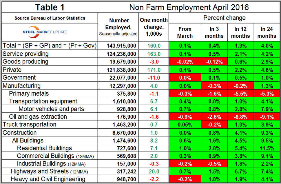 The good news in April was that job creation in manufacturing industries was positive after back to back poor results in February and March. Manufacturing added 4,000 jobs in April but has only added 9,000 in the 16 months since and including January last year. Table 1 shows that in April manufacturing was propped up by the transportation equipment sector and that most of that strength was in automobiles and parts. Truck transportation also had positive growth after two loosing months. Oil and gas and primary metals continued their losing streaks which have extended for 13 and 10 months respectively. Note the subcomponents of both manufacturing and construction shown in Table 1 don’t add up to the total because we have only included those that have most relevance to the steel industry. Construction has leapt ahead of manufacturing as a job creator but it must be recognized that productivity increases in manufacturing are very much greater than they are in construction.