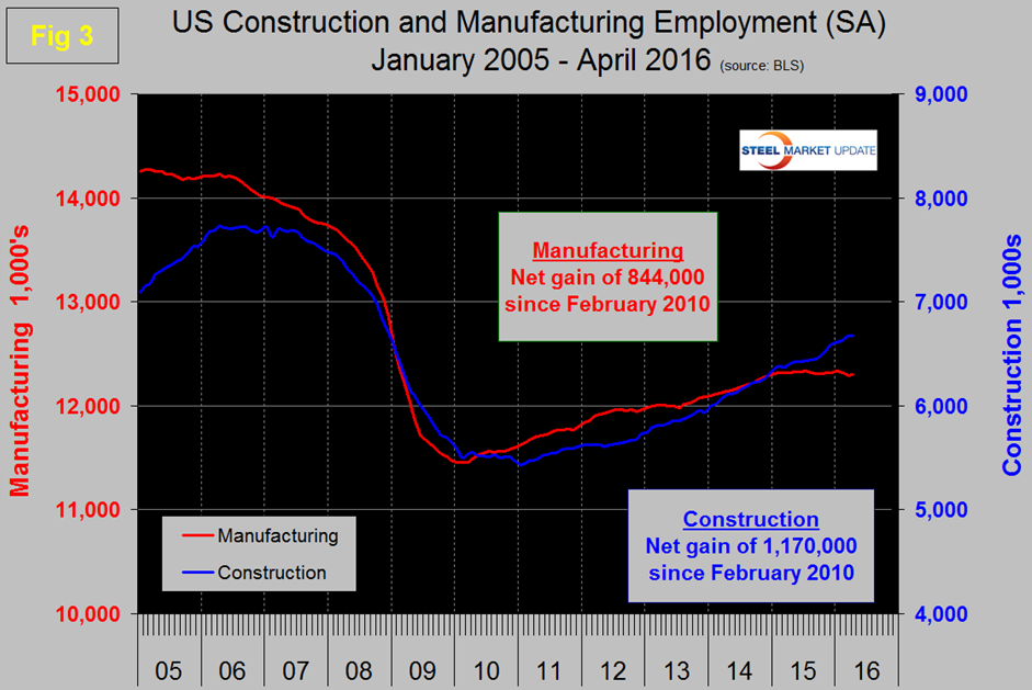 Construction added 1,000 jobs in April for a total of 369,000 in the 16 months since and including January 2015. Some of the major construction sub categories are routinely reported one month in arrears which distorts the data in Table 1. These include, industrial buildings, commercial buildings and highways and streets. Construction has added 1,170,000 jobs and manufacturing 844,000 since the recessionary employment low point in February 2010 (Figure 3).