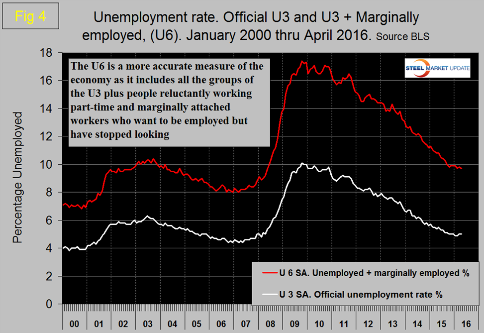 The official unemployment rate known as U3, decreased from 5.5 percent in May last year to 4.9 percent in January and February before increasing again to 5.0 percent in March and April. This number doesn’t take into consideration those who have stopped looking. The more comprehensive U6 unemployment rate decreased from 11.3 percent in January 2015 to 9.7 percent in this latest data (Figure 4).