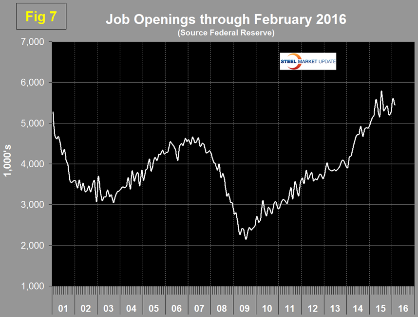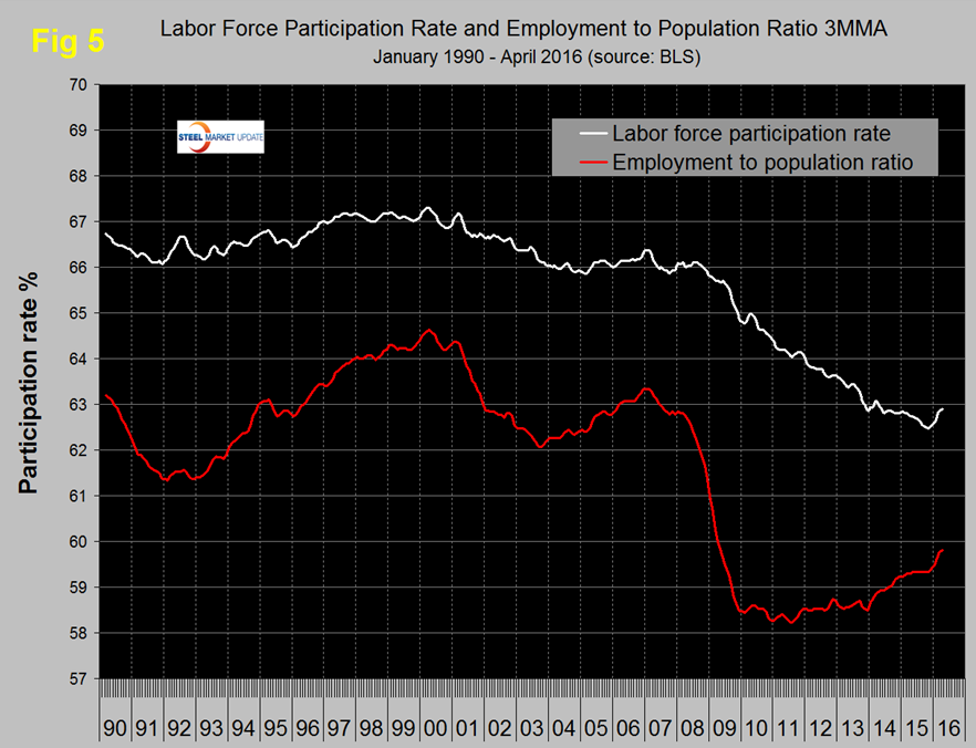 The employment participation rate is widely quoted in the press as going nowhere. In April 2016 the rate was 62.8 percent which was the same as October 2013. There has been an uptick from a low of 62.4 percent in September last year. We’re not sure that we understand what this is a percentage “of” because of the multiple descriptions of the labor pool. Another measure is the number employed as a percentage of the population which we think is much more definitive. In April this measure stood at 59.7 percent which was up from 58.8 percent in January 2014. Figure 5 shows both measures on one graph.