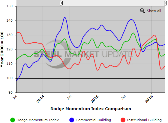 Below is a graph showing the history of the Dodge Momentum Index. You will need to view the graph on our website to use it’s interactive features, you can do so by clicking here. If you need assistance with either logging in or navigating the website, please contact our office at 800-432-3475 or info@SteelMarketUpdate.com.