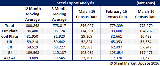 March steel exports totaled 775,270 net tons (703,314 metric tons), down 0.5 percent over February and down 13.5 percent from March 2015. Total March figures are below both the thee month moving average (3MMA, average of January 2016 through March 2016 figures) and the twelve month moving average (12MMA, average of April 2015 through March 2016 data). Here is a breakdown of flat rolled and plate exports: