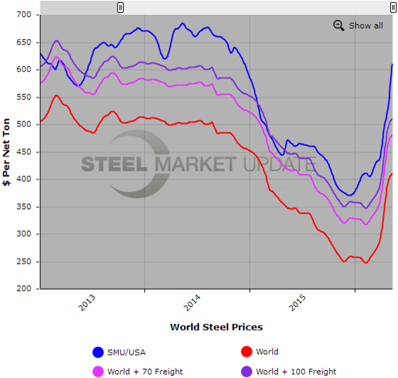 The latest Steel Market Update hot rolled price average is $610 per ton for domestic steel, up $80 per ton compared to the last time we did an update on world prices and up $120 per ton over our mid-April price. The theoretical spread between the world HR export price and the SMU HR price is $100 to $130 per ton ($200 prior to import costs), up $64 from our previous analysis and up $46 from mid-April.
