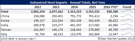 India, Taiwan and Italian galvanized exports have dropped dramatically while South Korea continues to ship galvanized steel at levels seen in 2012 and 2013.