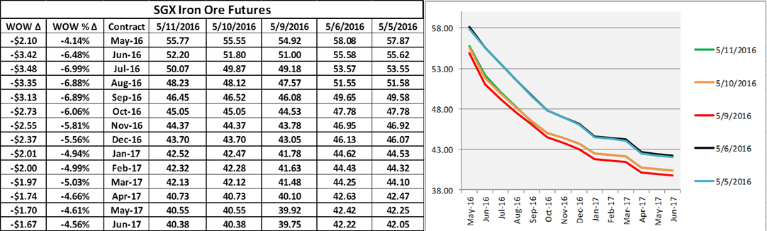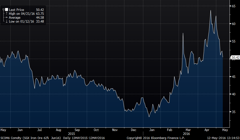 Iron ore futures continue to come off following restrictions placed on Chinese futures exchanges to limit speculation. The June iron ore futures price is down 21 percent to $50.42/t from $63.75/t on April 21st.