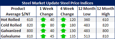 This week the benchmark hot rolled steel price average was reported by Steel Market Update at $610 per ton, up $40 per ton over the previous week and $120 per ton higher than just one month ago. The numbers reported this week are the highs for this calendar year and, are also the 52 week highs.