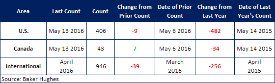 According to Baker Hughes data from May 13, 2016, the U.S rig count for the week was 406 rigs exploring for or developing oil or natural gas. This is a decrease of 9 rigs when compared to last week, with oil rigs down 10 to 318 rigs, gas rigs up 1 to 87 rigs, and miscellaneous rigs unchanged at 1 rig. Compared to this time last year, the 406 count is down 482 rigs, with oil rigs down 342, gas rigs down 136, and miscellaneous rigs down 4.