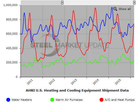 Below is a graph showing the history of water heater, warm air furnace, and air conditioner shipments. You will need to view the graph on our website to use it’s interactive features, you can do so by clicking here. If you need assistance with either logging in or navigating the website, please contact our office at 800-432-3475 or info@SteelMarketUpdate.com.