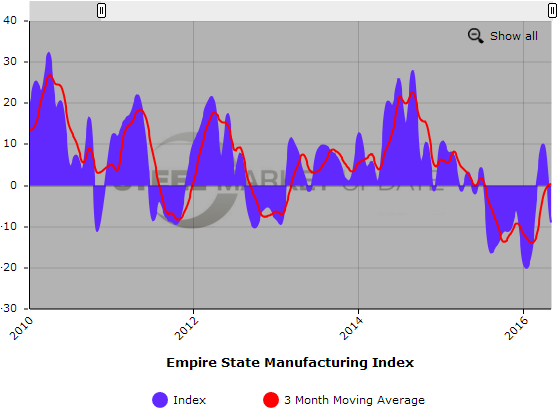 Below is a graph showing the history of the Empire State Manufacturing Index. You will need to view the graph on our website to use it’s interactive features, you can do so by clicking here. If you need assistance with either logging in or navigating the website, please contact our office at 800-432-3475 or info@SteelMarketUpdate.com.