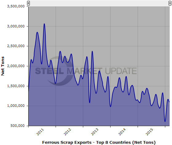 Below is a graph showing the history of total ferrous scrap exports, to use it’s interactive features and explore different countries you must visit out website by clicking here. If you need assistance with either logging in or navigating the website, please contact our office at 800-432-3475 or info@SteelMarketUpdate.com.