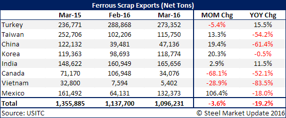 Comparing March 2016 to March 2015, March 2016 total scrap exports are 19.2 percent lower than the same month one year ago. This is primarily due to a heavy decline in tonnage to Taiwan and China, with Canada and Vietnam showing smaller declines also. An increase in exports to Turkey and India slightly negated the change.