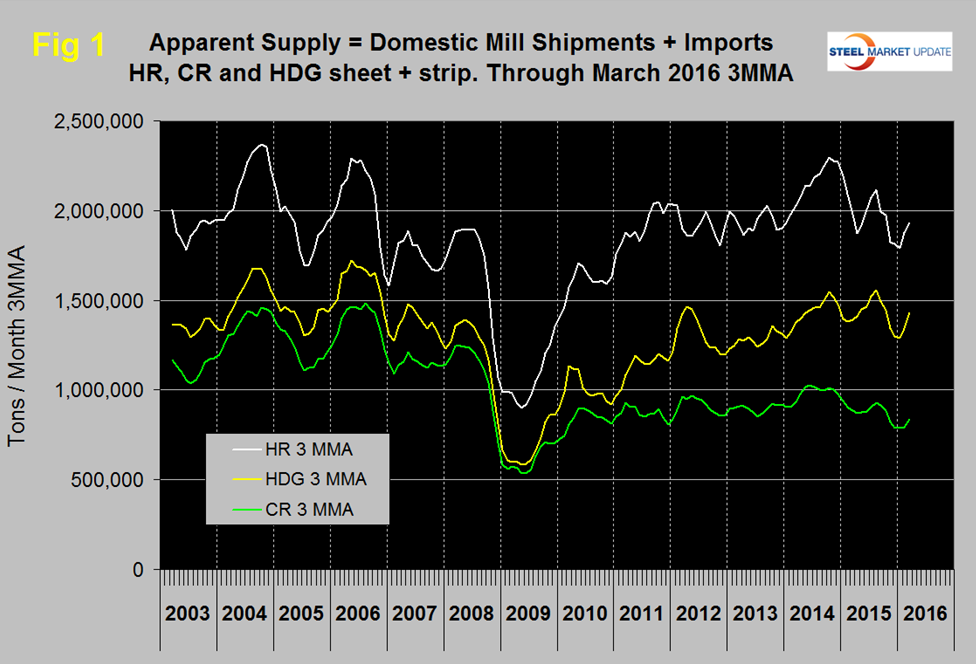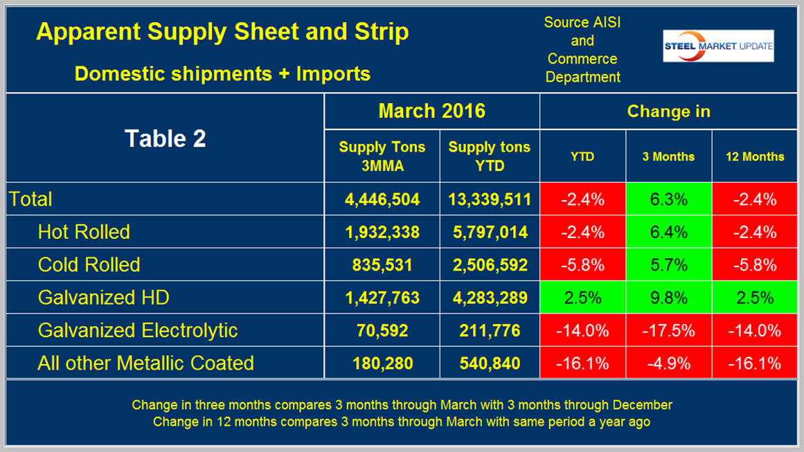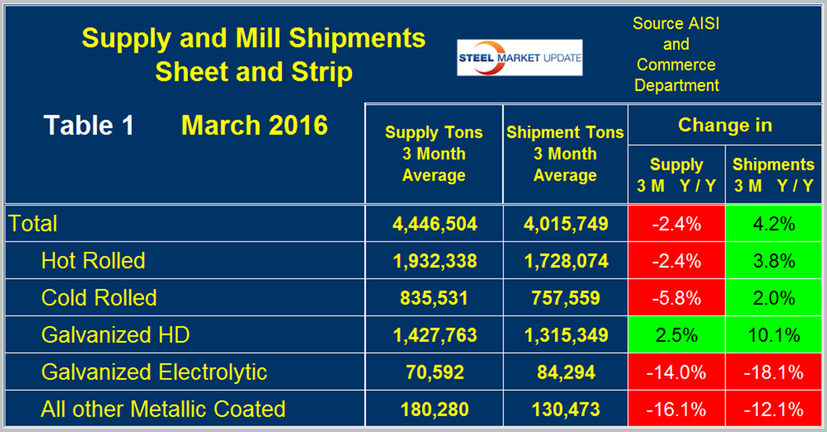 Table 1 shows both apparent supply and mill shipments of sheet products (shipments includes exports) side by side as a three month average through March, for both 2015 and 2016.
