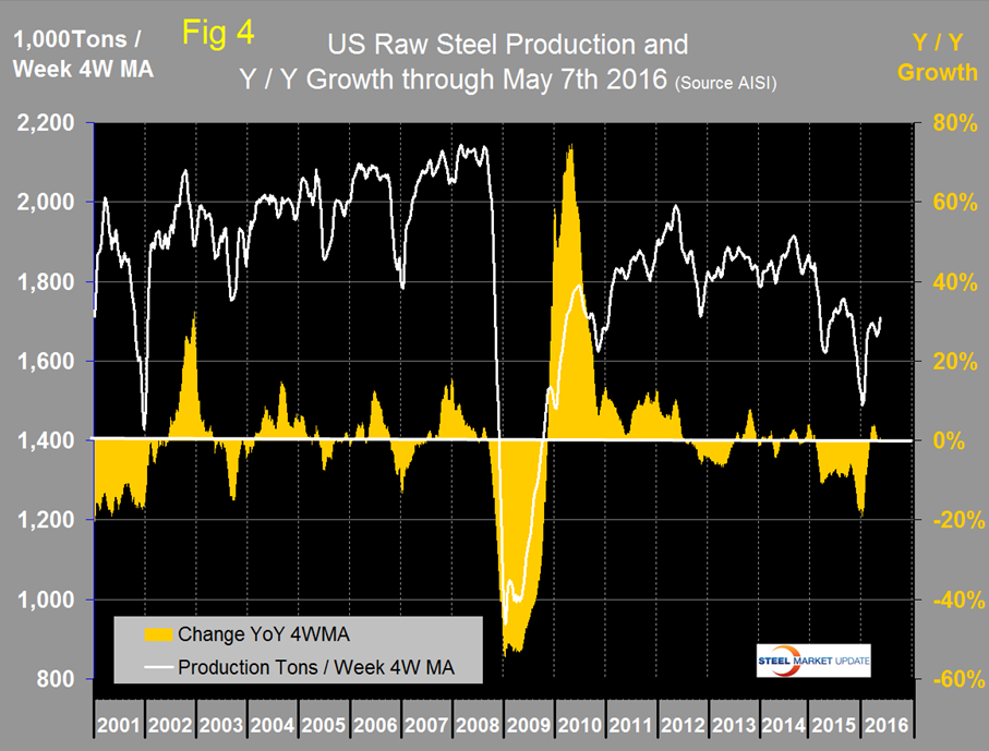 SMU Comment: The numbers in this report illustrate why it’s necessary to look at different time periods to try to understand the whole picture. We could draw different conclusions based on which time period we chose to describe. Another problem is that it’s now mid-May and the latest data we have for shipments and supply is for March. The AISI puts out weekly data for crude steel production the latest for which was w/e May 7th. This provides the most current data for steel mill activity. Figure 4 shows the Y/Y change in weekly crude output which didn’t become positive until March 6th.