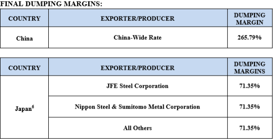 Today, the Department of Commerce announced its affirmative final determinations in the AD investigations of imports of certain cold-rolled steel flat products (cold-rolled steel) from China and Japan, and CVD investigation of imports of cold-rolled steel from China. Commerce determined imports of cold-rolled steel from China and Japan have been sold in the U.S. at dumping margins of 265.79 percent and 71.35 percent, respectively. Commerce also determined that imports of cold-rolled steel from China received countervailable subsidies of 256.44 percent.