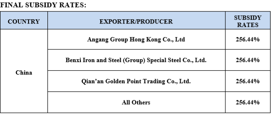In the China CVD investigation, the Government of China, mandatory respondents Angang Group Hong Kong Co., Ltd. and Benxi Iron and Steel (Group) Special Steel Co., Ltd., and Qian’an Golden Point Trading Co., Ltd., a non-cooperative exporter, all failed to respond to Commerce’s requests for information. Thus, all imports of cold-rolled steel from China will be subject to a CVD rate of 256.44 percent.