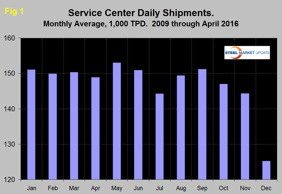 Based on Steel Market Update (SMU) analysis of the recently released MSCI service center inventory and shipment data, total service center carbon steel shipments decreased by 84,700 tons in April to 3.091 million tons. This decrease was driven by the number of shipping days, down by 2 to 21. On a t/d basis shipments increased from 138,000 tons in March to 147,200 tons in April. In the eight years since and including 2009, April shipments on average on a t/d basis have been down by 0.9 percent from March. This year shipments were up by 6.6 percent.