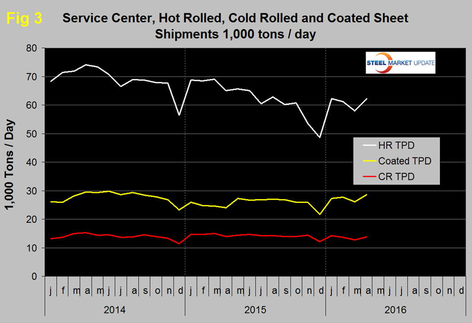Total daily shipments had a post recessionary high of 173,300 in April 2014 and as shown by the brown bars in Figure 2 have had 14 consecutive months of negative y/y growth. In April shipments of all long products, plate and tubulars were down year over year. Sheet products in total were up by 1.7 percent lifted into positive territory by coated products that were up by 19.2 percent. Figure 3 shows the historical shipping rate of the three major sheet products since January 2014.