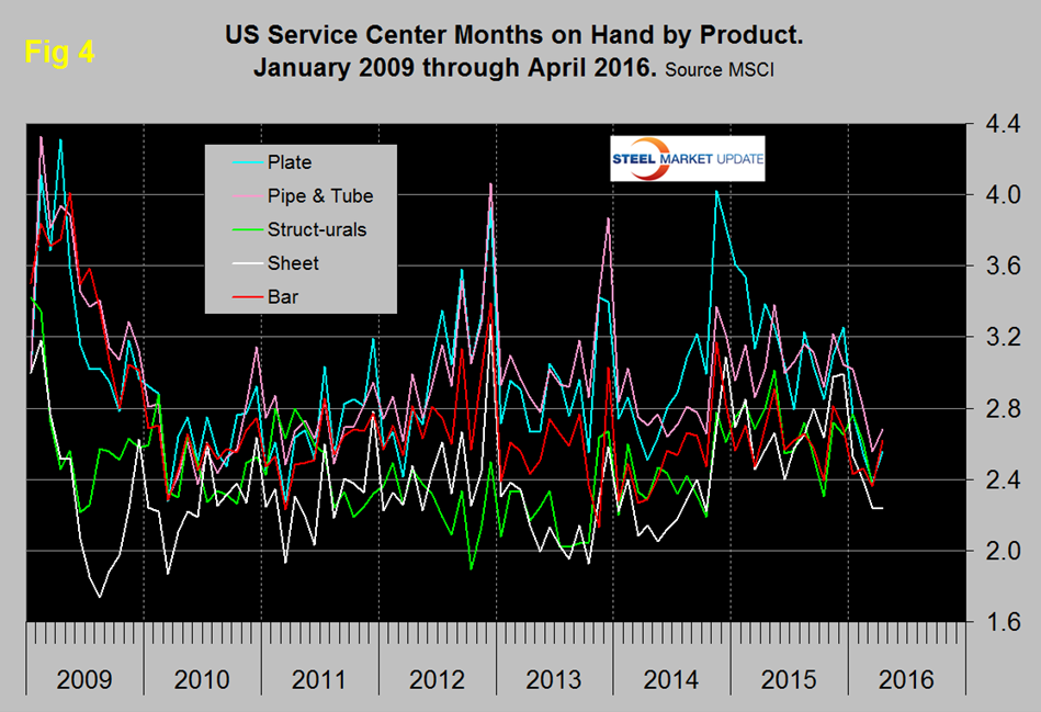 April closed with months on hand (MoH) of 2.34, up from 2.29 at the end of March. All products except coated sheet had a double digit y/y decrease in MoH and plate was down by 37.9 percent. Figure 4 shows the MoH by product monthly since January 2009. Pipe and tube currently has the highest months on hand.