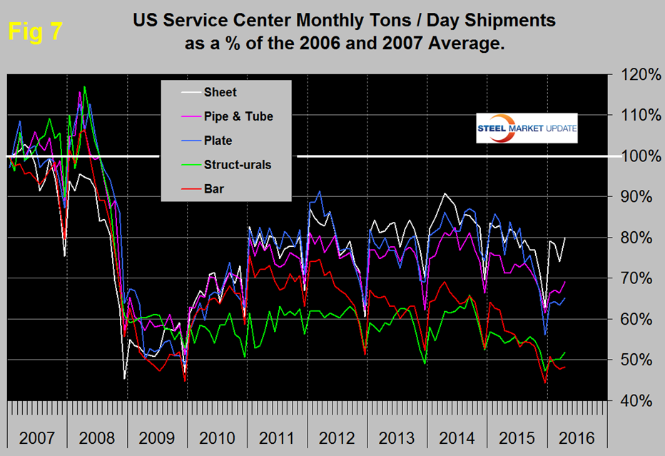All products experienced the normal end of year collapse and January pick up. The total of carbon steel products is now at 69.3 percent of the shipping rate that existed in 2006 and 2007, with structurals and bar at 51.8 percent and 48.3 percent respectively. Sheet is at 80.0 percent, plate at 65.2 percent and tubulars at 69.2 percent.