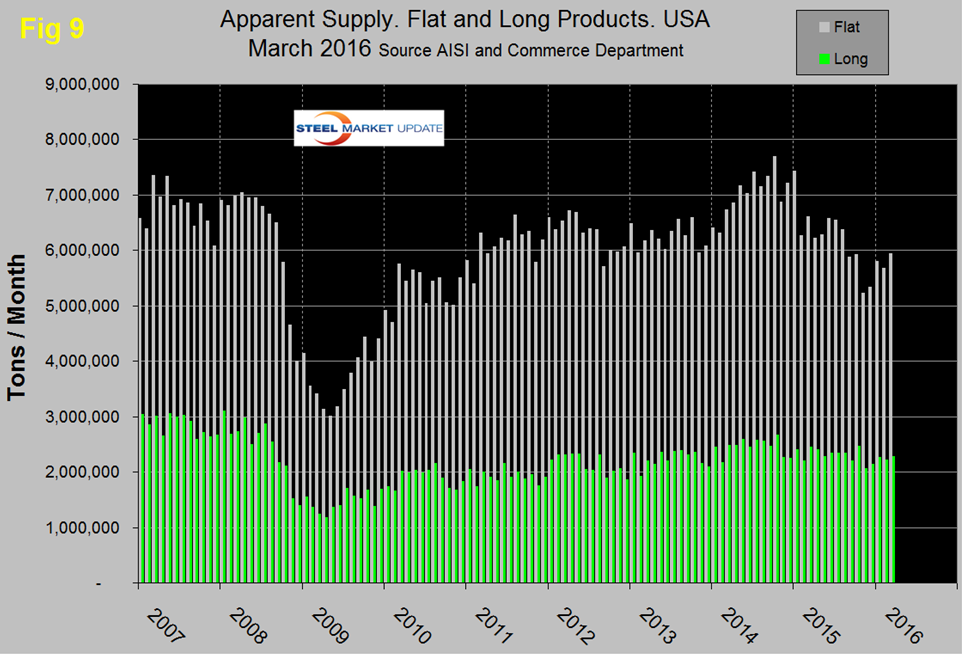SMU Comment: In Figures 2, 5, 6 and 8, the white lines show t/d shipments. There was a distinct decline in shipments for all major product groups in 2015 on a y/y basis and this decline is ongoing. The good news is that for flat rolled the decline is slowing. Figure 9 shows the total supply to the market of long and flat products based on AISI shipment and import data.