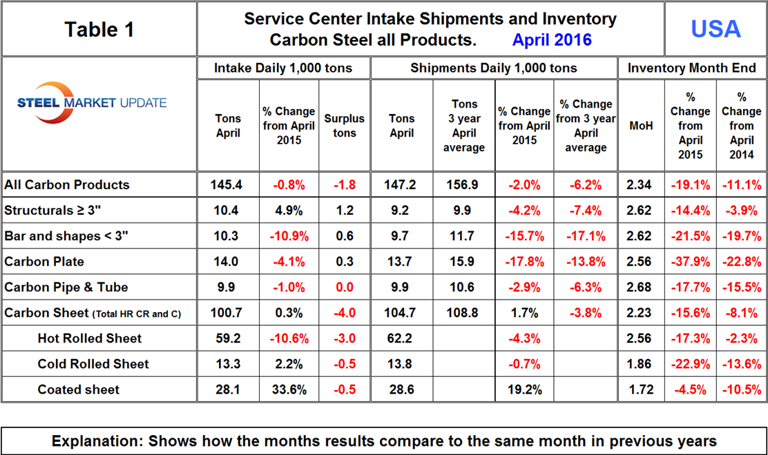 We then calculate the percent change between April 2016 and April 2015 and with the 3 year April average. Our intention is to provide an undistorted view of market direction. In April, intake at 145,400 t/d was 1,800 tons less than shipments. This was the seventh month of deficit after three months of surplus. Total sheet products had a deficit of 4,000 tons but intake was up by 0.3 percent y/y.