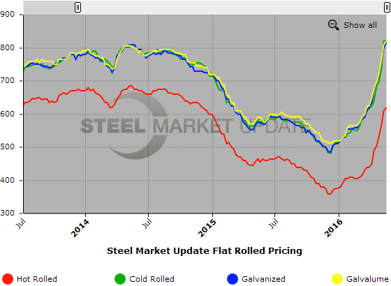 SMU Note: Below is a graphic showing our hot rolled, cold rolled, galvanized, and Galvalume price history. To use the graphs interactive capabilities, you must view it on our website here. If you need help navigating the website or need to know your login information, contact us at info@SteelMarketUpdate.com or by calling 800-432-3475.