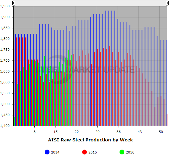 For the week ending May 14, 2016, the American Iron & Steel Institute (AISI) estimated the U.S. steel industry produced 1,727,000 net tons of raw steel, a 1.2 percent decrease over the previous week, but a 1.3 percent increase over the same week one year ago. The estimated capacity utilization rate is 73.9 percent, down from 74.7 percent last week, but up from 72.1 percent this time last year.
