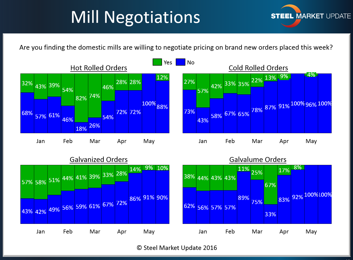 Both Galvalume and Cold Rolled were reported to have zero negotiating room while hot rolled (12 percent) and galvanized (10 percent) barely registered on our graphic. We will let the graphic tell the story.
