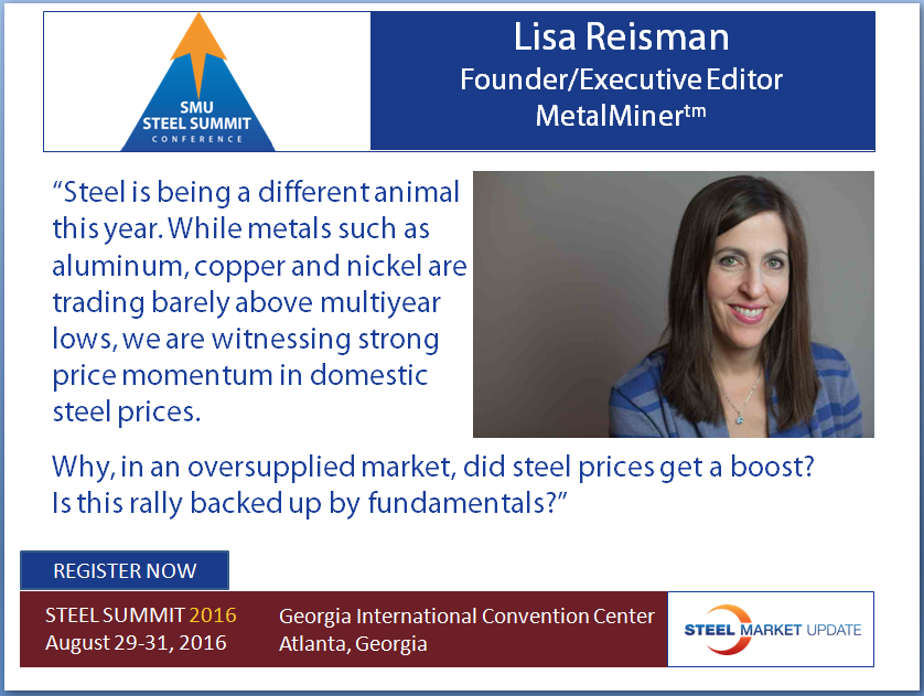 SMU Comment: Lisa Reisman will be one of our featured presenters during our 6th Steel Summit Conference. She will not only discuss and forecast the steel markets but also other metals such as copper, zinc and aluminum.