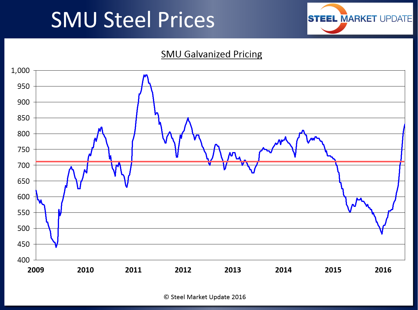 We published these numbers before but we find it interesting to review the average price for hot rolled, cold rolled and base price on galvanized and Galvalume since we began indexing flat rolled pricing back in January 2009.