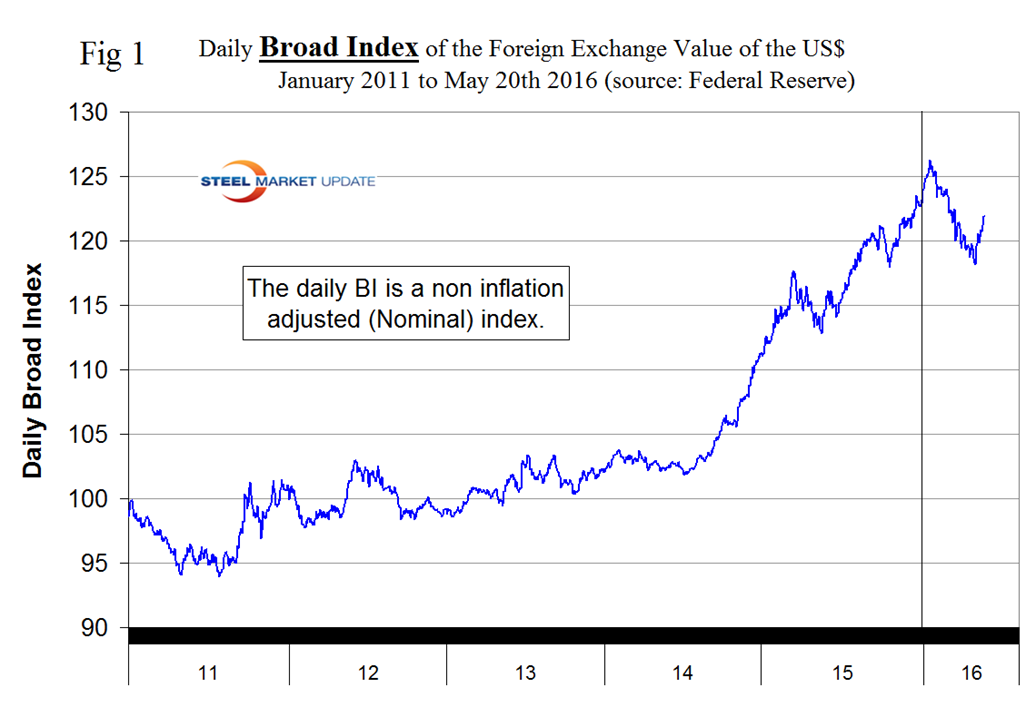We regard strengthening of the US Dollar as negative and weakening as positive because the effect on net imports. An estimated 25 percent of the U.S. economy had some involvement in international trade therefore currency swings can have a large effects on the economy in general and of the steel industry in particular. The steel trading currencies have been on a rollercoaster this year similar to the broad index in Figure 1. In our January 25th update the dollar strengthened against 15 of the 16 currencies under consideration at the 3 month level as traders increased their dollar positions to obtain a better return on their assets. In our February 21st update the dollar strengthened against 14 of 16 at the 3 month level. In our April 18th update the dollar did a complete reversal and weakened against 14 of the 16 steel and raw materials trading currencies. In this May 24th update at the one month level, the dollar has strengthened against 11 of the 16 currencies under consideration here. Looking at the 7 day level in this latest data the dollar is still strengthening against 14 of the 16 steel trading currencies meaning that the trend is ongoing.