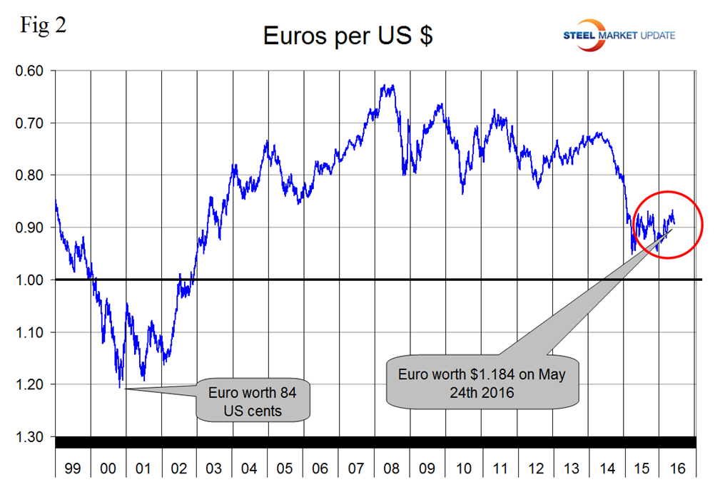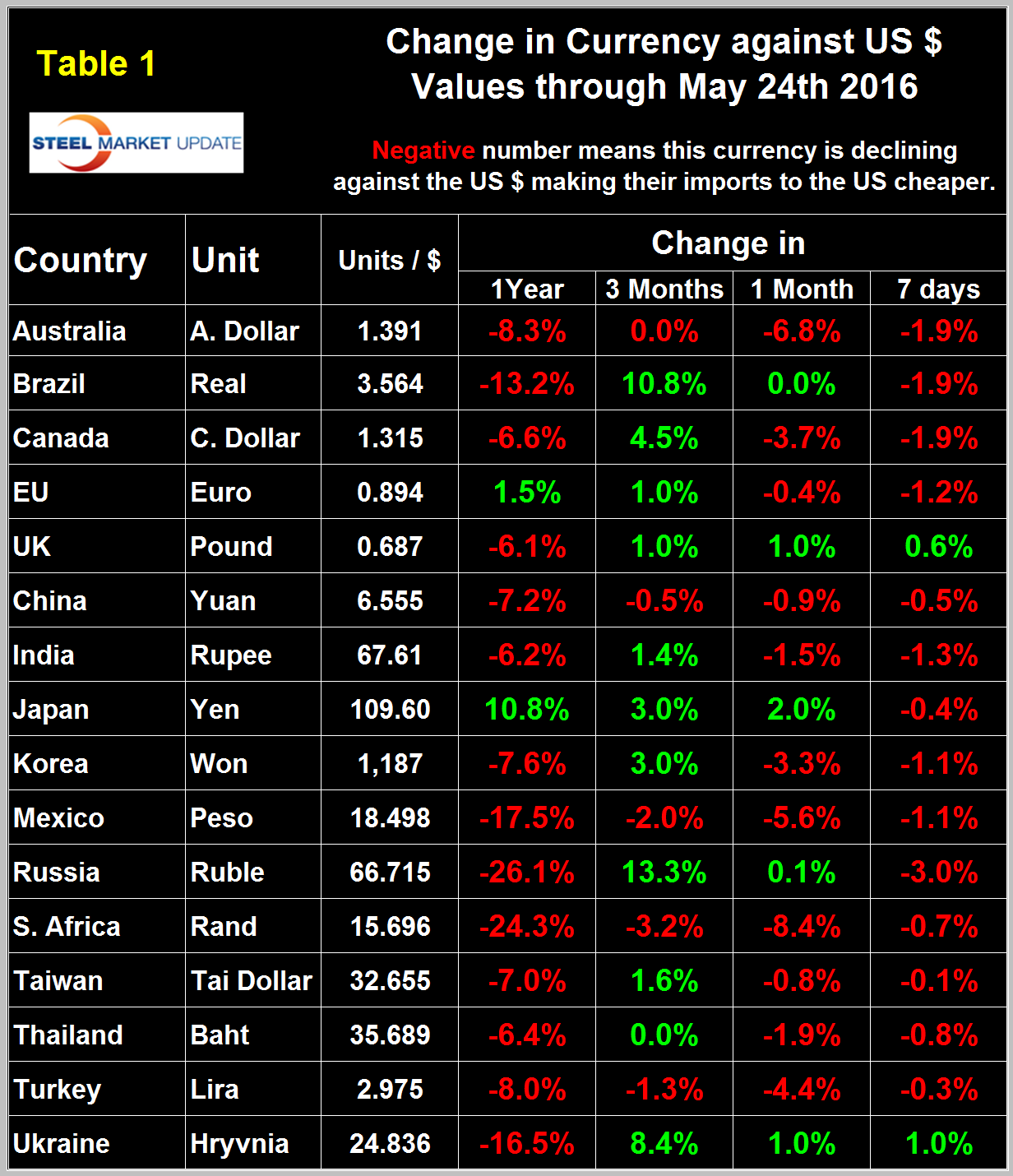 In each of these reports we comment on a few of the 16 steel trading currencies listed in Table 1 and include extracts from sources that we have come across that we deem credible. Charts for each of the 16 currencies listed in Table 1 are available through May 24th for any reader who requests them.
