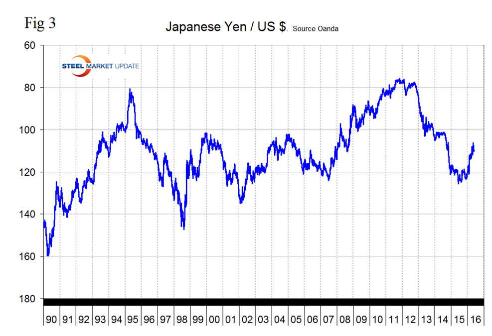 One of the most important indices a steel buyer (or seller) can follow is that of the value of the U.S. dollar vs. the currency of the key steel trading nations. As the dollar value rises or falls, commodities, including steel, tend to be affected. Currency update articles are normally reserved for our Premium Members but we wanted to share it with our all of our members and the steel industry in general in tonight’s special issue of SMU.