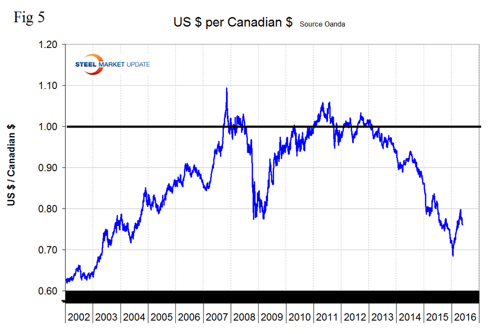 Figure 5 shows the value of the C$ since January 2002. In the three months before May 24th the C$ appreciated by 4.5 percent but has lost 3.7 percent in the last 30 days. The C$ is now worth 76.06 US cents