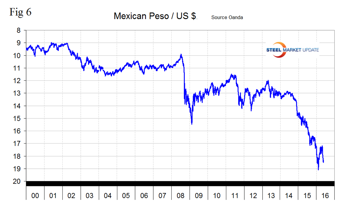 Figure 6 shows the value of the Peso since January 2000. In the 30 days before May 24th the Peso lost 5.6 percent and it now takes 18.5 Pesos to buy a US $.