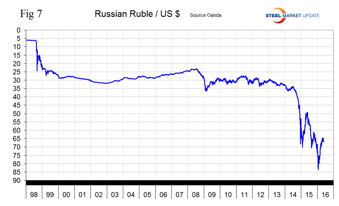 Figure 7 shows the value of the Russian Ruble since January 1998. In the three months before May 24th the Ruble appreciated by 13.3 percent but lost 3.0 percent in the last 7 days.