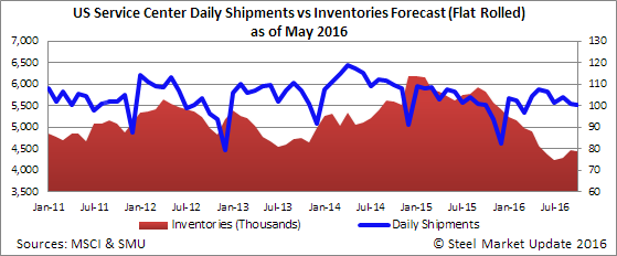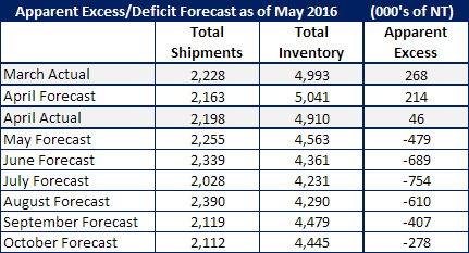 Our May forecast is based on total shipments of 2,255,000 tons. We believe receipts will remain constrained due to limited foreign and controlled order entry out of the domestic mills (which have been running at a fairly constant rate in the upper 80% level for sheet capacity utilization rates). Inventories should drop from 5.0 million tons to 4.563 million tons which would put the U.S. flat rolled steel service centers into a deficit for the first time since the summer 2014.