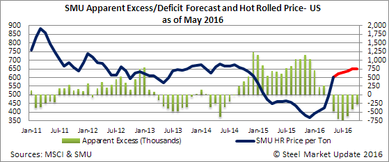 U.S. flat rolled steel service centers were able to reduce their excess inventories by 222,000 tons, according to our proprietary analysis of the MSCI data released earlier this month. Our Apparent Excess/Deficit model has the distributors carrying a 46,000 ton excess as of the end of April. This is the first time we have seen inventories close to “balanced” or a slight deficit since August 2014 when the distributors were carrying a deficit of 9,000 tons. Our expectation is for the service center carbon flat rolled inventories to continue to drop pushing into a deficit as early as the end of this month (May).