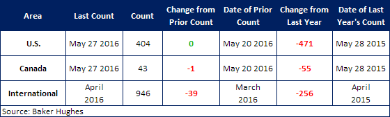 According to Baker Hughes data from May 27, 2016, the U.S rig count for the week was 404 rigs exploring for or developing oil or natural gas. This is unchanged compared to last week, with oil rigs down 2 to 316 rigs, gas rigs up 2 to 87 rigs, and miscellaneous rigs unchanged at 1 rig. Compared to this time last year, the 404 count is down 471 rigs, with oil rigs down 330, gas rigs down 138, and miscellaneous rigs down 3.