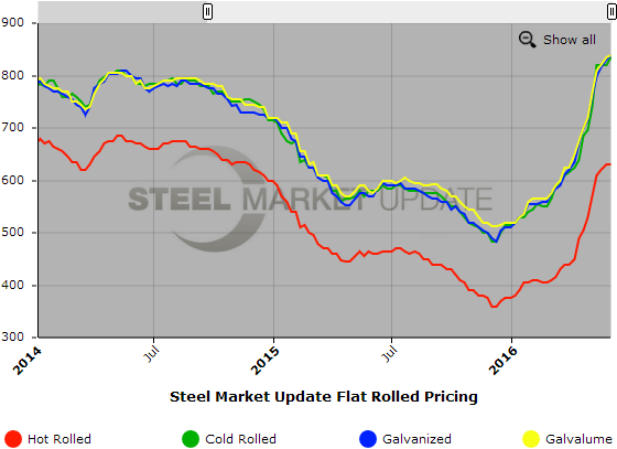 SMU Note: Below is a graphic showing our hot rolled, cold rolled, galvanized, and Galvalume price history. To use the graphs interactive capabilities, you must view it on our website here. If you need help navigating the website or need to know your login information, contact us at info@SteelMarketUpdate.com or by calling 800-432-3475.