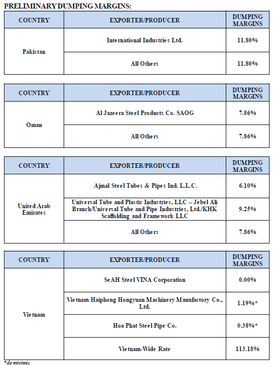 On June 1, 2016, the Department of Commerce announced its affirmative preliminary determinations in the antidumping (AD) investigations of imports of circular welded carbon-quality steel pipe from Pakistan, Oman, United Arab Emirates, and Vietnam.