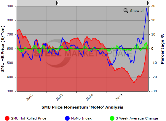 MoMo was measured at 19.15 percent this week, meaning that the current HRC price is higher than the average price over the last 12 weeks.