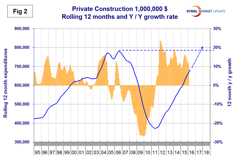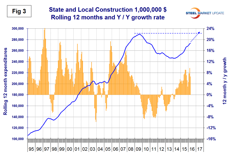 The 10.2 percent growth of total construction y/y was led by private work up by 11.9 percent. State and locally financed work was up by 6.6 percent and Federal was down by 1.1 percent. Momentum was negative for private and federal work but positive for state and local. We consider four sectors within total construction. These are non-residential, residential, infrastructure and other which is a catch all and includes industrial, utilities and power. Nonresidential building construction had negative momentum but infrastructure, accelerated in the latest data. The growth rate of non-residential and residential buildings are at double digit rates. The growth rate of “Other” became very negative at the time of the oil price collapse but has recovered to positive growth in the last eight months. The growth rate of total construction is shown by the brown bars in Figure 1. The pre-recession peak of total construction on a rolling 12 month basis was $1,028 B in 12 months through September 2006. The low point was $665.1 B in 12 months through October 2011. The 12 month total through the latest data of April 2016 was $977.8 B. July 2015 through April 2016 were the first months to exceed $900 B since March 2009 when the recession was gaining traction.